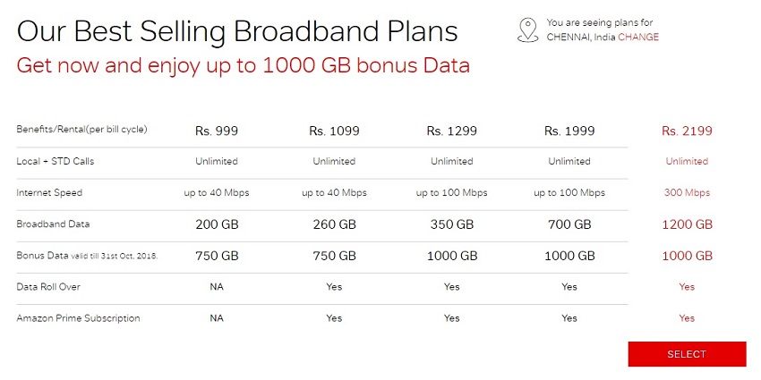 At Rs. 2,199, Airtel is now offering 1200GB of data which will run at a speed of 300mbps. The plan also brings data rollover support which means additional data can be carry forwarded to the next billing cycle. Also, the IPS is providing 1000GB of additional data which will be valid until October 31, 2018. Customers will also get unlimited Local and STD calls alongside the internet. If that is not enough to attract you, Airtel is also providing Amazon Prime subscription to the customers.
