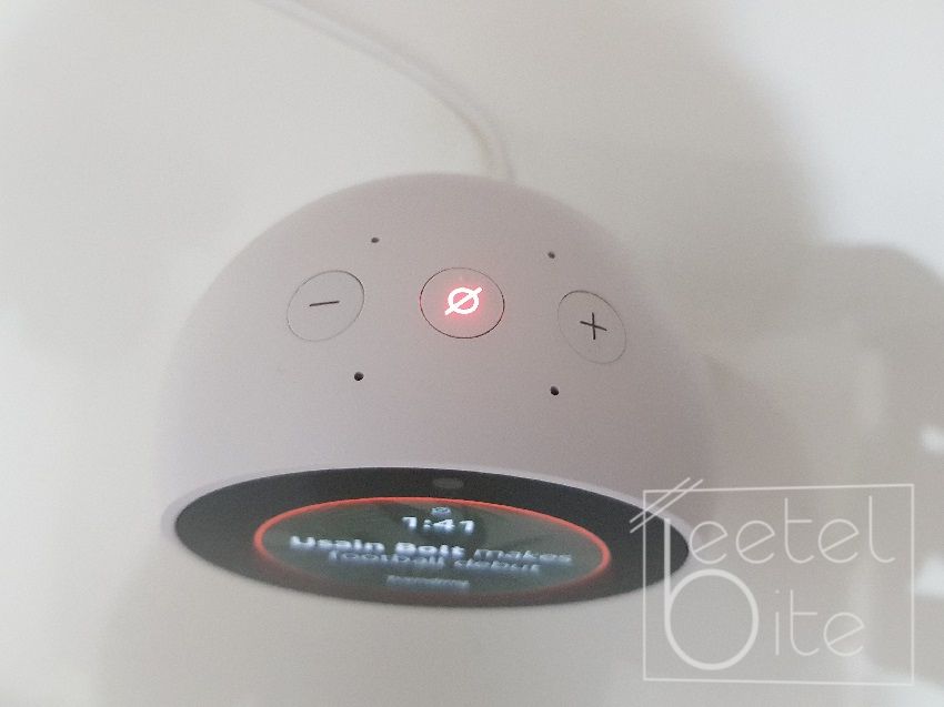 On the top of the Echo Spot, there are three buttons two of which are volume controls and the middle one allows you to mute the microphone so it stops listening to you. The buttons are surrounded by the four microphones. Up front, there is a circular 2.5-inch IPS LCD display with a resolution of 480x480 pixels. Above the display is a camera which you can also turn off in the settings if you have privacy concerns. When the camera is enabled it can be used to make video calls to other Alexa devices.