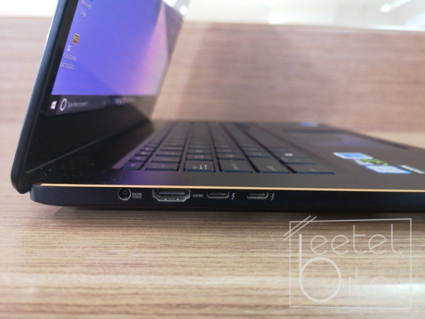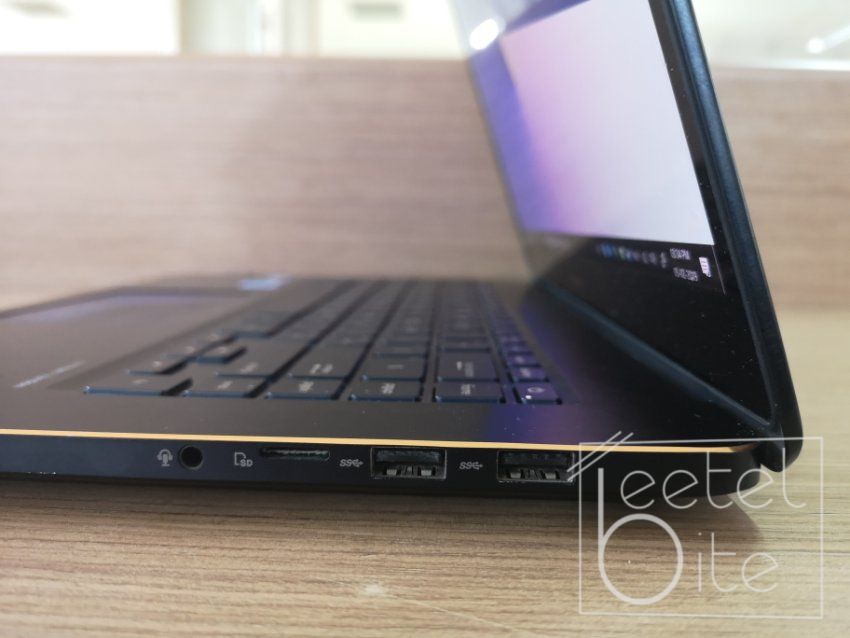The laptop features a power-in port, an HDMI port and two USB Type-C ThunderBolt 3 ports on the left. On the right-hand side, it consists of two full-size USB 3.0 ports along with a microSD card slot and 3.5mm headphone jack.