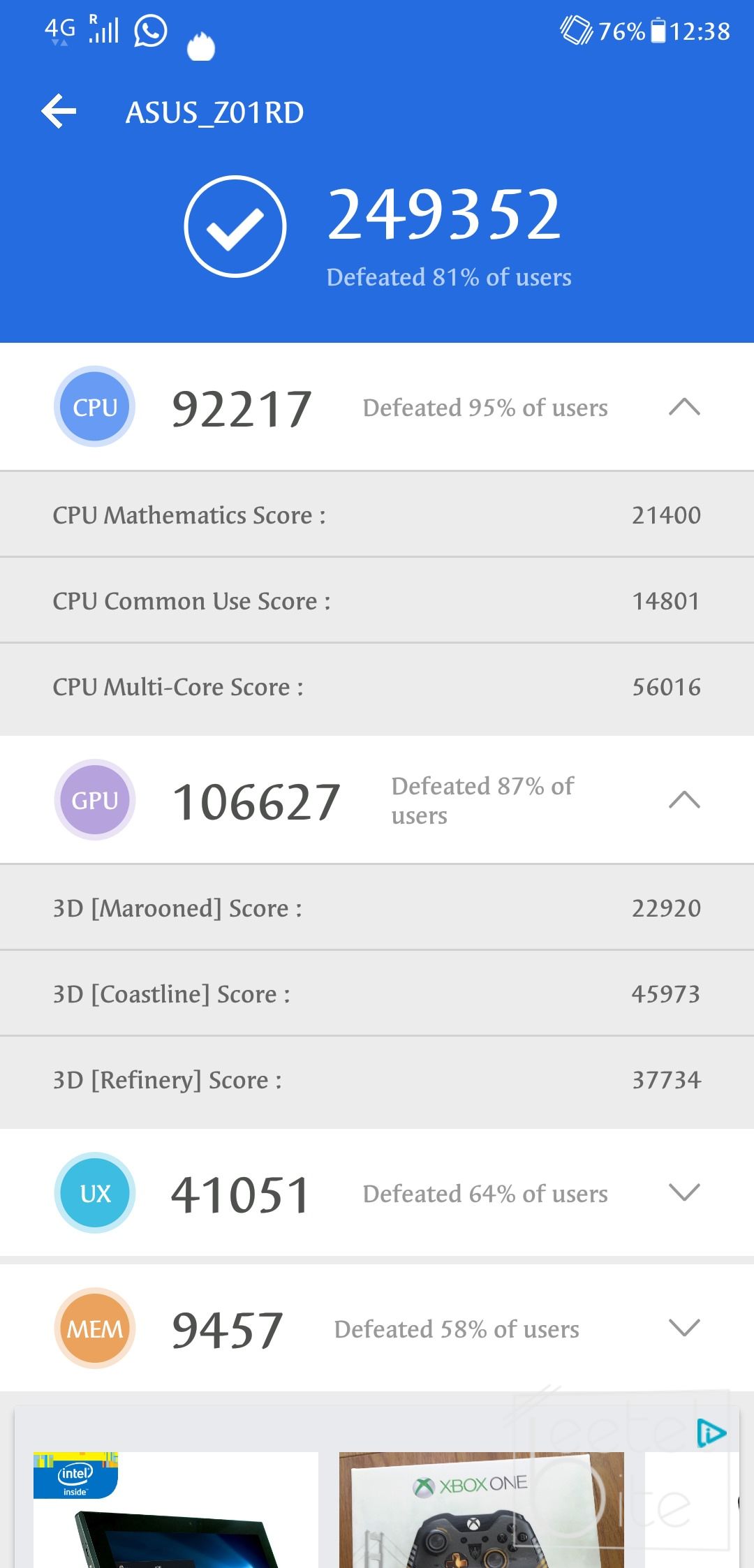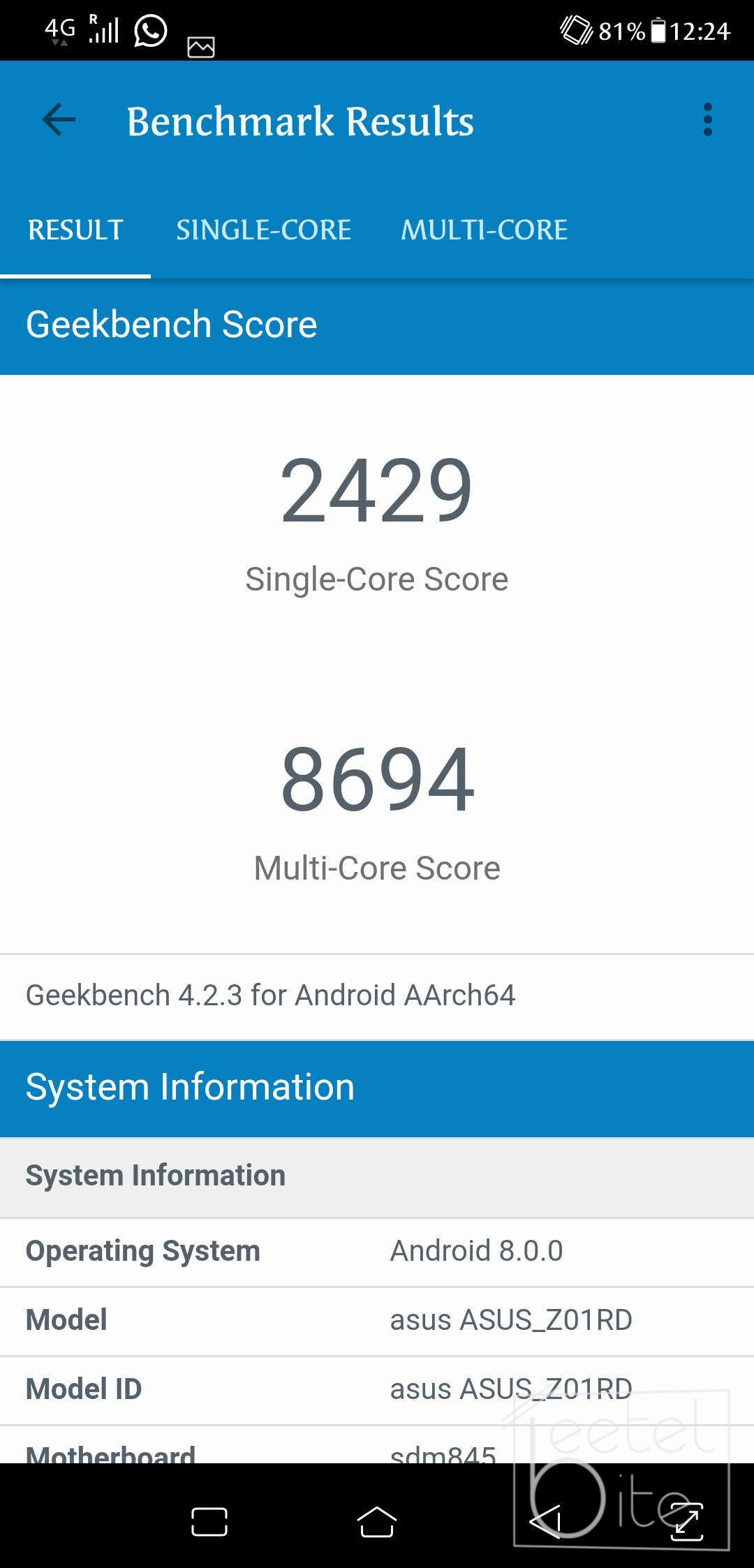 The Asus ZenFone 5Z managed to score 2429 on Geekbench's Single Core test while the Multi-Core test achieved a score of 8694. Antutu Benchmarks gave the ZenFone 5Z an impressive score of 249352.