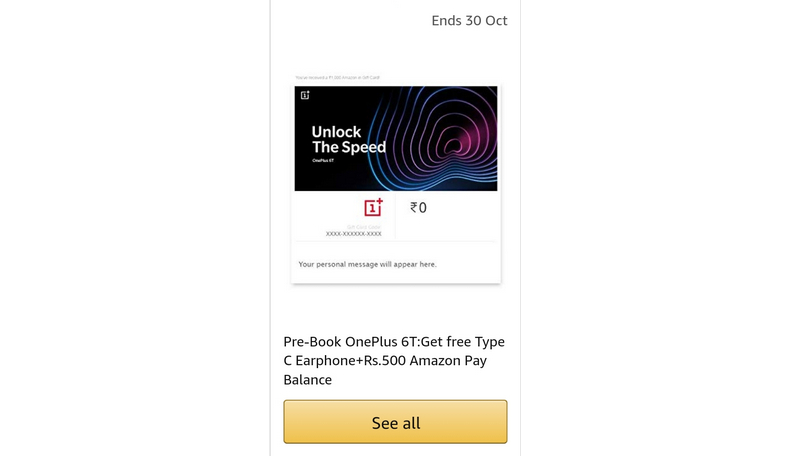 - Use the coupon code at the time of buying the OnePlus 6T. The coupon will allow you to get the free Type-C earphones and the Rs. 500 Amazon Pay balance.