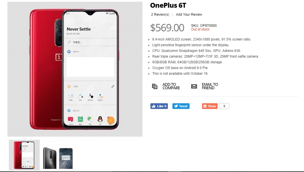 OnePlus 6T was recently spotted on Giztop, an e-commerce website. The OnePlus 6T has been put up for pre-orders and the website claims that the device is currently out of stock and will only be available after October 16. We have also had leaks before this one which claimed that OnePlus is planning to launch their next smartphone in October this time around.