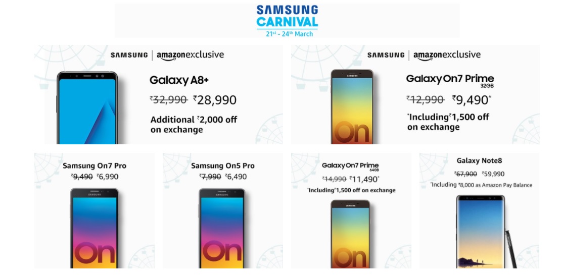 Samsung and Amazon have again tied up to bring the Samsung Carnival sale. The Samsung Carnival kicks off on March 21 and will go on until the March 24. The sale is offering massive discounts on smartphones including Samsung Galaxy A8+, Galaxy On7 Prime, On7 Pro, Galaxy Note 8 and many more. The company will also be offering discounts on Samsung TVs, refrigerators and washing machines.