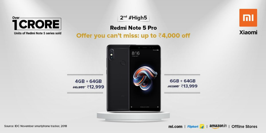 Xiaomi Redmi Note 5 Pro is now available at a price of Rs. 12,999 in oppose to its MRP of RS. 15,999 for the base variant. The 6GB RAM variant is now available for a price of Rs. 13,999. The top end variant was launched with a price tag of Rs. 17,999. The new pricing is effective starting today across Mi.com, Flipkart, Amazon India and offline stores.